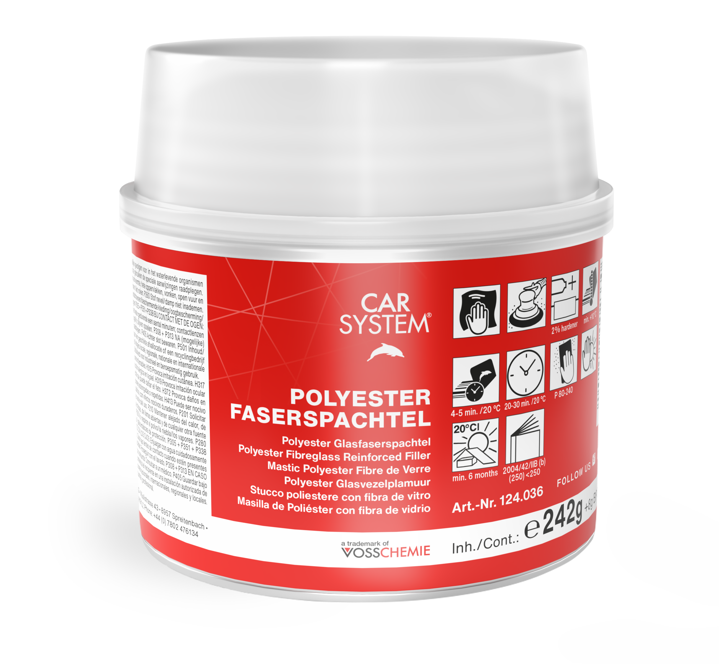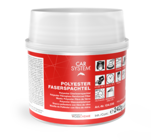Polyester GlasfaserspachtelDie Carsystem Glas Polyesterspachtelmasse ist ein Glasfaserspachtel mit extra langen Fasern, wodurch er sich perfekt für GFK Reparaturen und zum Füllen von sehr tiefen Unebenheiten oder zur Reparatur von entlackten Roststellen eignet.